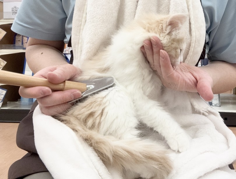 お手入れに飽きてきて嫌がったりした時は無理に押さえつけず、一旦お手入れをやめてリラックスできるように身体を撫でたり、話しかけたりして落ち着くのを待ちます。