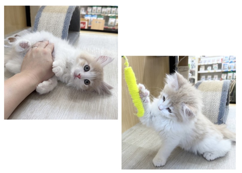 入店初日から緊張せずにキャットタワーに乗ったりオモチャで1人遊びを始めたサイベリアンくん。