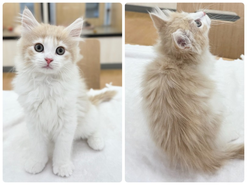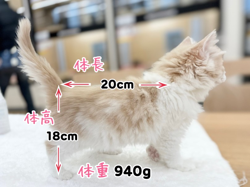 今はまだ子猫特有のフワフワした毛ですが、徐々に首周りのたてがみ(ラフ)や、お尻周りのブルーマーズ(飾り毛)がボリュームアップしていきます。