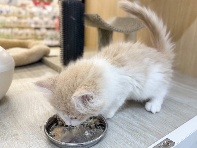現在、ニュートロの子猫用をふやかして粉ミルクをふりかけ少しウエットをトッピングしたご飯を食べています。