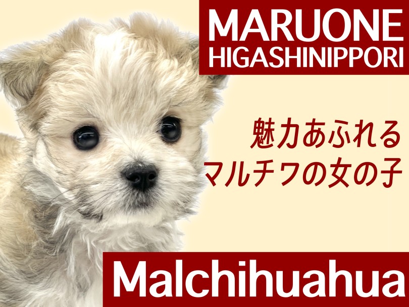 足立区、北区、台東区からもアクセス良好な東京都荒川区の犬猫専門ペットショップマルワン東日暮里店の最新子犬・子猫情報をご紹介いたします!!本日は思わず「可愛い!」と声がこぼれてしまうような魅力をたっぷり詰め込んだ、MIX犬(マルチーズ×チワワ)の女の子をご紹介いたします!