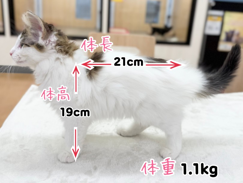 ボディはホワイトがベースで、尻尾や背中、オデコから後頭部にかけてブラウンが入っています。