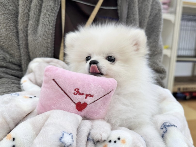 デビュー当初も新しい環境に動じることのなかったポメちゃん。入店から1ヶ月が経った現在は当初よりももっと時間の使い方が豊かになり、最近ではおもちゃをお口にくわえて遊ぶのがマイブーム!