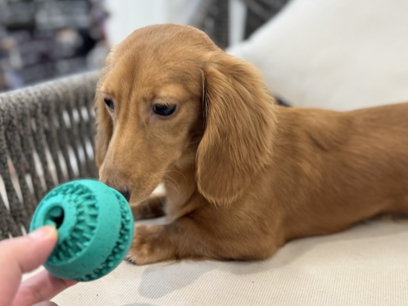 最近は【知育トイ】がお気に入りなご様子。おもちゃの中に、フードを詰めて遊べるのですが一心不乱に転がしてどうにか食べようとする姿はダックスらしさ満載(笑)