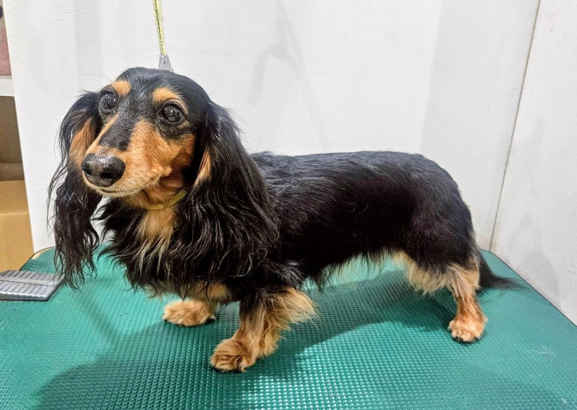 スタッフの愛犬ダツちゃん(カニヘンダックスフント)に協力してもらいました。シニアの子で、毛量がやや少なく、被毛も細くなってきている状態です。