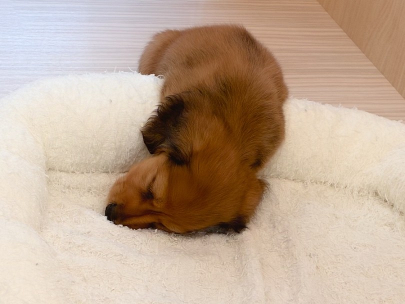 ▲ベッドにちまっと寝てる姿は最上級の癒しなのです♡環境変化の順応も早く、特に初めてのペットライフをご検討中のご家族さまにも自信を持っておすすめできる逸材です!