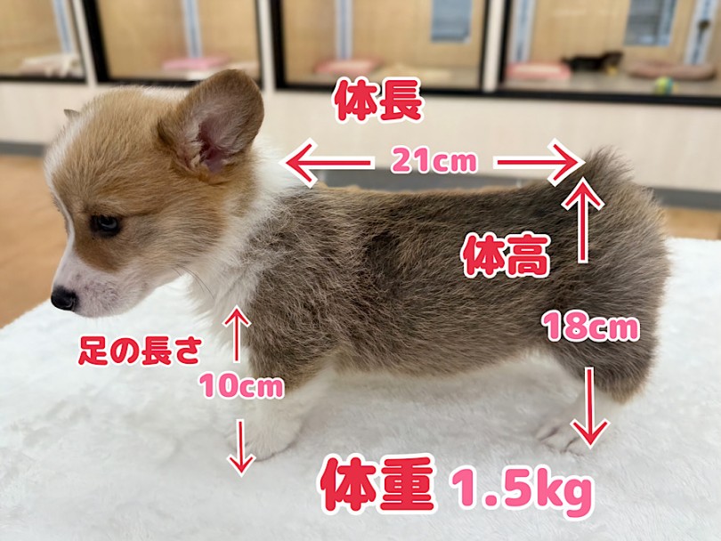 4/21測定体重1.5kg、体長21cm、体高18cm、足の長さ10cmのむっちり胴長短足ちゃん。