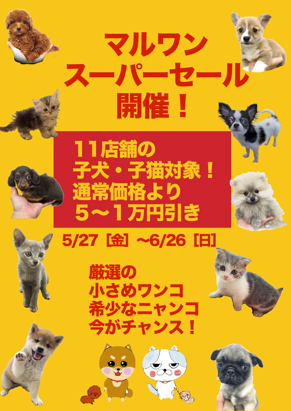 マルワン11店舗の子犬&子猫を対象に通常価格の5〜1万円OFFのスーパーセール開催中です!